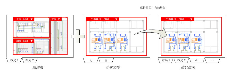 因为可读取布局中布置的视口和视口专用对象、图纸空间对象,所以也可原样读取尺寸、尺寸文字、2维图例、剪辑视口、断线处理、图层显示设置等。
